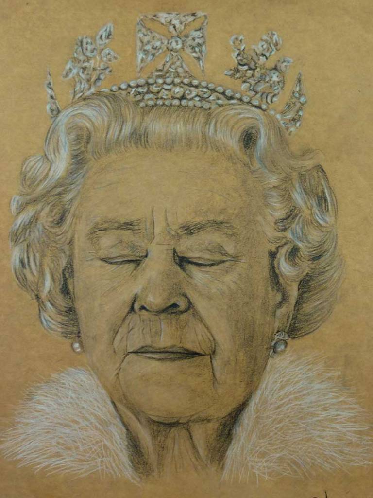 Published 13. Dezember 2015 at 800 × 1067 in Grafik „Queen Elizabeth II – Asleep“ Kohle und Buntstift auf Backpapier 36,5 cm x 27,5 cm