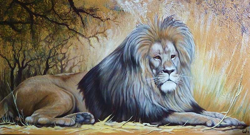 Published 13. Dezember 2015 at 800 × 433 in TIERE, LANDSCHAFTEN etc. „Lying Lion“ Mischtechnik auf Leinwand 110 cm x 60 cm